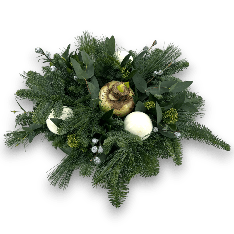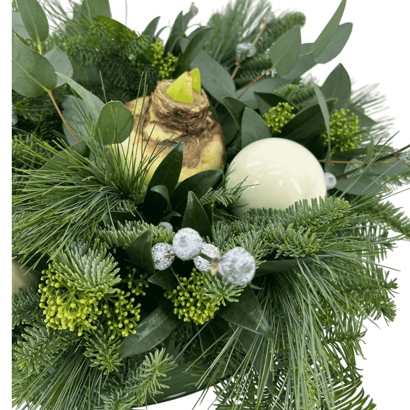 Een mooie opgevulde glazen schaal met kerstgroen, kerstballen en een amaryllisbol.
